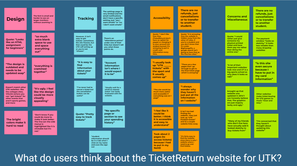 The main users of this website have one goal in mind: buy a sporting event ticket. My team and I hit campus to see who we could provide feedback on their experiences. I had talked to students with tickets to the upcoming football game, and those who were planning to buy tickets, both repeat customers or first time users. Other primary users included UTK staff and avid fans of SEC football, but the main users of the TicketReturn site had been students.