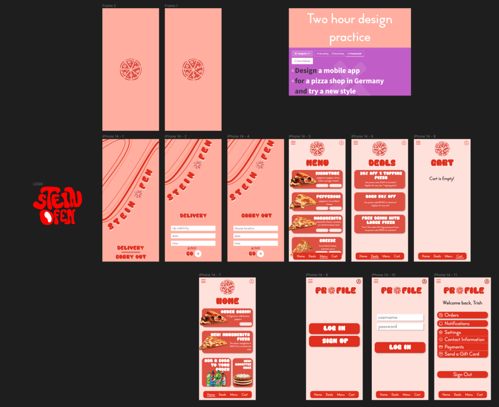 The prompt of this design was a mobile app for a pizza shop in Germany with a different style than I usually take. This took about an hour and 45 minutes with a 5 minute hand drawn logo design.